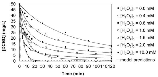 The addition of hydrogen peroxide markedly enhanced the degradation efficiency. At moderate oxidant concentrations ([H2O2]0 = 0.4–1.5 mM), the residual DCBQ concentration decreased progressively with increasing [H2O2], reaching only 2.0 mg/L after 120 min for [H2O2]0 = 1.5 mM. This trend clearly indicates that hydroxyl radicals (HO•), generated from H2O2 photolysis, are the dominant oxidizing agents, and that the overall removal strongly depends on both the pollutant concentration and the availability of reactive species. When operating with excess oxidant ([H2O2]0 ≥ 2.0 mM), complete elimination of DCBQ was achieved. At [H2O2]0 = 2.0 mM, total removal occurred within 120 min, whereas at [H2O2]0 = 10.0 mM, the degradation was significantly faster, with DCBQ fully eliminated well before the end of the irradiation period. This highlights the dual role of hydrogen peroxide: at moderate levels it enhances radical generation, while at excessive levels it may also act as a radical scavenger; however, continuous radical production under high [H2O2] ensures complete pollutant removal.