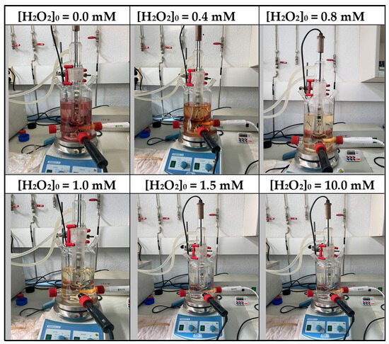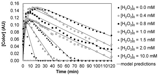 Table 2, confirm their dependence on the applied hydrogen peroxide concentration (Equations (9)–(11)). The strong agreement between model predictions and experimental observations validates the suitability of the proposed kinetic model to describe the evolution of color under different oxidative scenarios.