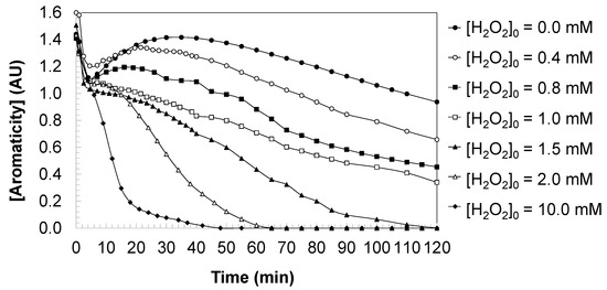 At and above 2.0 mM H2O2 the system attains conditions in which aromaticity is fully abolished (final 0.0 AU). This transition to complete de-aromatization indicates that the oxidative pathway proceeds beyond substitution and partial oxidation to effective ring-opening, fragmentation, and formation of low-molecular-weight, non-conjugated oxidation products (carboxylic acids and inorganic end-products). Kinetically, the disappearance of aromatic signal under excess oxidant is consistent with a regime in which radical availability is sufficiently high and sustained to drive the overall process to completion within the irradiation period; consequently, the apparent reaction order and rate constants inferred from the DCBQ mass-loss kinetics shift toward higher effective rates (and in the highest oxidant case toward pseudo-first-order behavior shown in Equation (5)), which is mirrored by the complete loss of aromaticity.