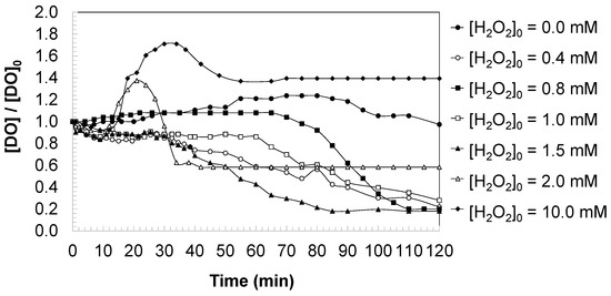 When hydrogen peroxide was introduced, distinct changes in DO concentration were observed, which depended on the oxidant dose. At moderate concentrations ([H2O2]0 = 0.4–1.5 mM), DO/DO0 decreased progressively during irradiation, reflecting the consumption of dissolved oxygen associated with the oxidative degradation of aromatic intermediates. This behavior can be attributed to two processes: (i) the direct involvement of oxygen in radical-driven oxidation reactions and (ii) the formation of partially oxidized intermediates that temporarily sequester oxygen through aromatic hydroxylation or quinone–hydroquinone transformations.