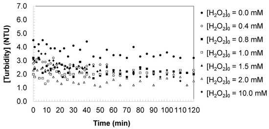2 process under the specified experimental conditions. In the absence of hydrogen peroxide, turbidity remained essentially unchanged throughout irradiation, indicating that direct UV exposure alone does not generate a significant amount of particulate matter or colloidal species.