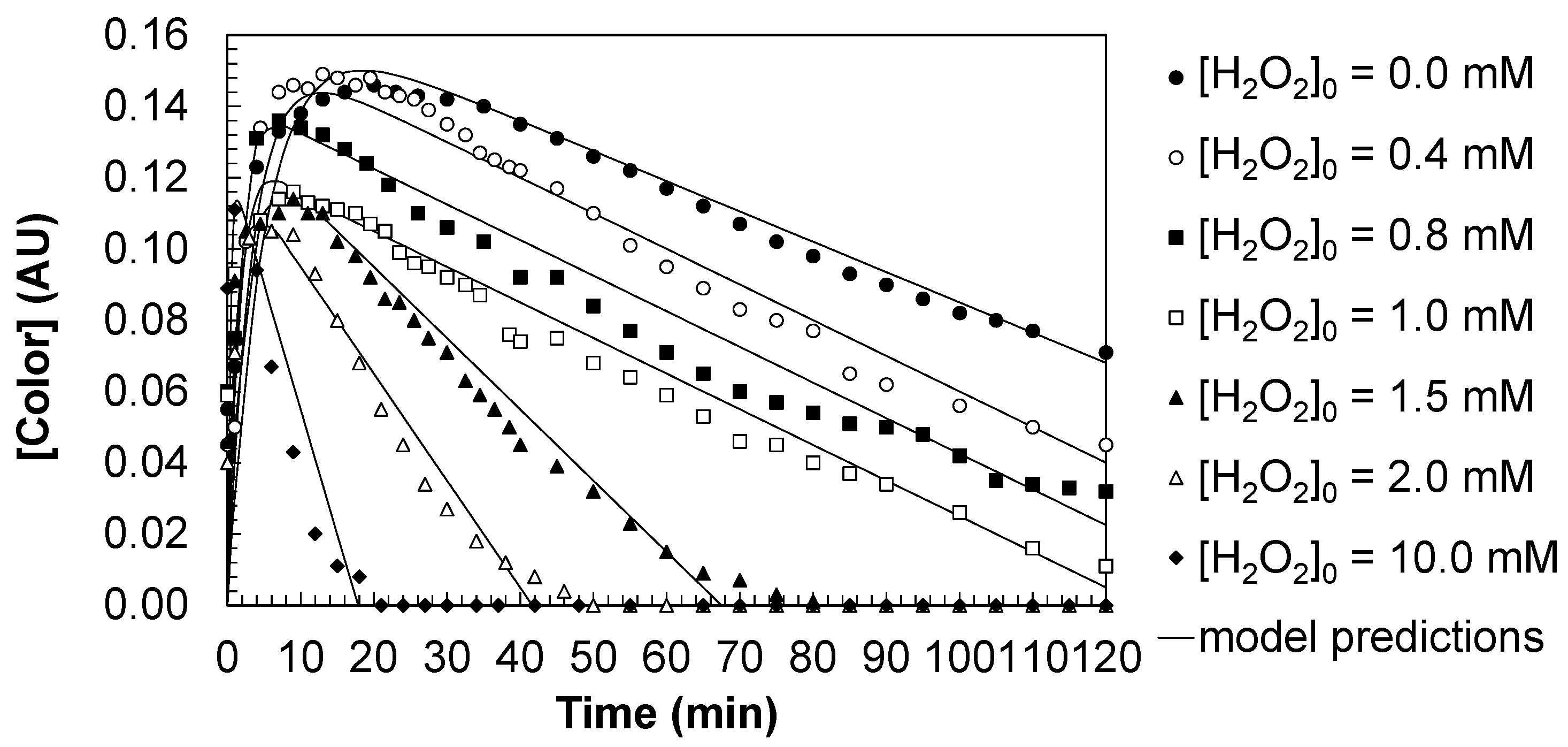 k Color , f = 0.2746   [ H 2 O 2 ] 0 + 0.2556