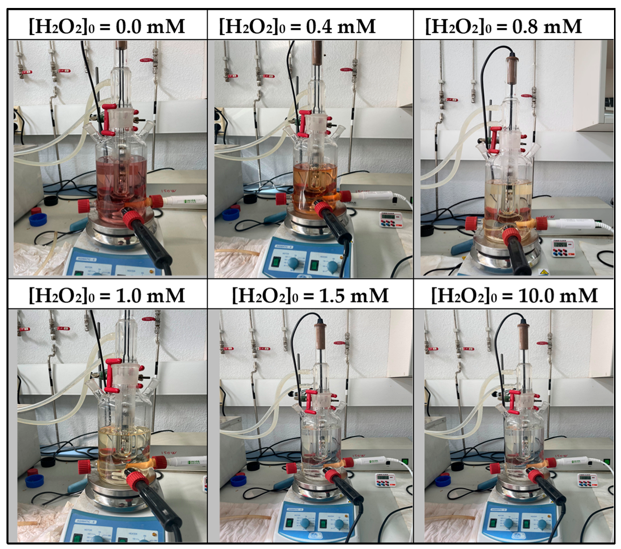 The required dose of hydrogen peroxide ([H2O2]0 = 0–10.0 mM; Panreac, Castellar del Vallès, Spain; H2O2, 30% w/v) was then introduced, and the UV lamp was turned on at the same time; this point was designated as t = 0. Photocatalytic runs were conducted for 120 min, during which sequential water quality parameters were monitored in real time. Aromaticity and color were determined at 254 nm and 455 nm, respectively, with a UV/Vis spectrophotometer (V-630, Jasco, Madrid, Spain). Dissolved oxygen (DO, mg/L) was measured using a dissolved oxygen meter (HI 9142, Hanna Instruments S.L., Eibar, Spain).