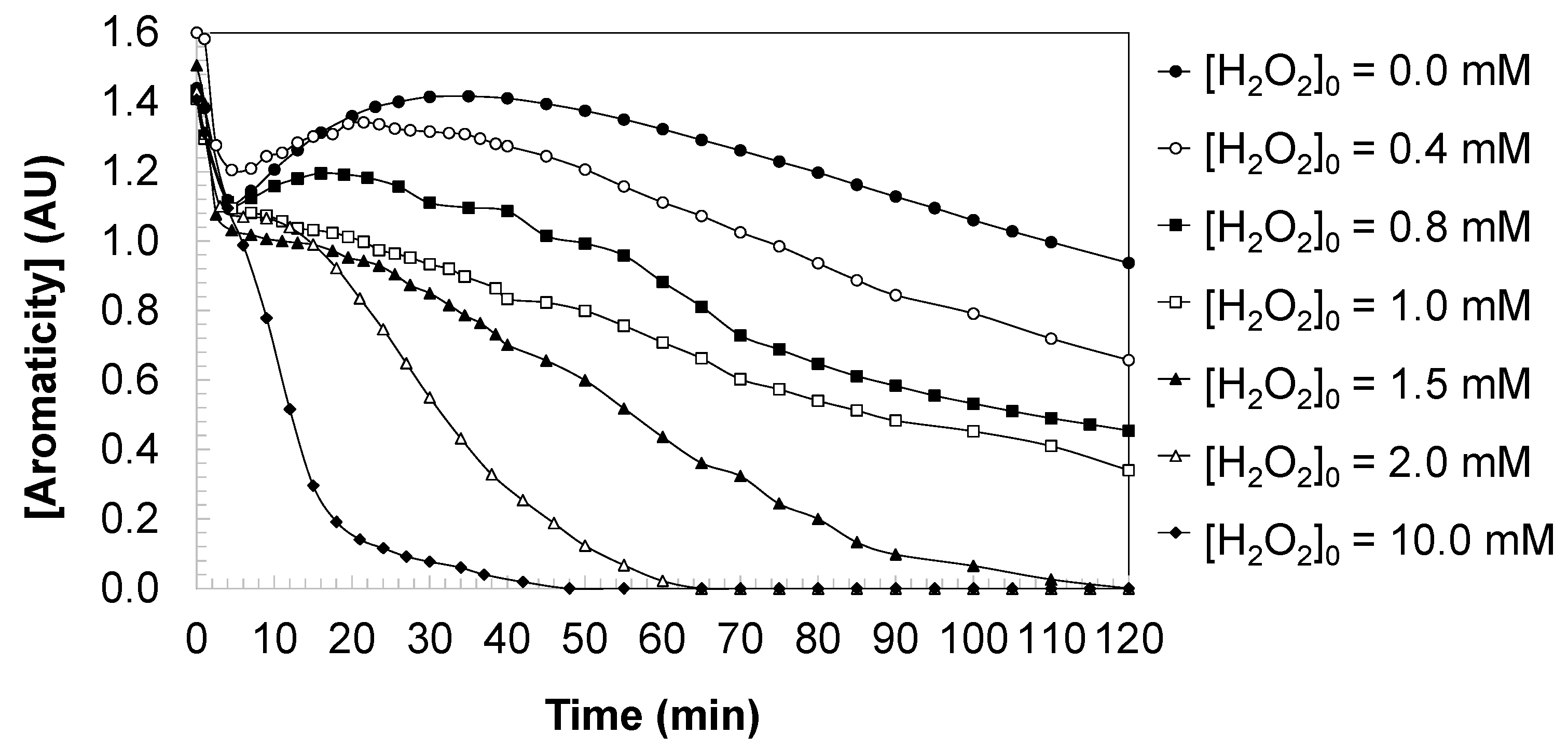 Figure 5 depicts the evolution of sample aromaticity during the oxidation of DCBQ by direct UV photolysis and by the decline of UV/H2O2 as irradiation proceeds, and the extent of removal after 120 min is strongly dependent on the initial hydrogen peroxide dose (Table 2). These results demonstrate a clear, monotonic relationship between oxidant loading and the loss of conjugated chromophores responsible for aromatic UV-Vis absorbance.