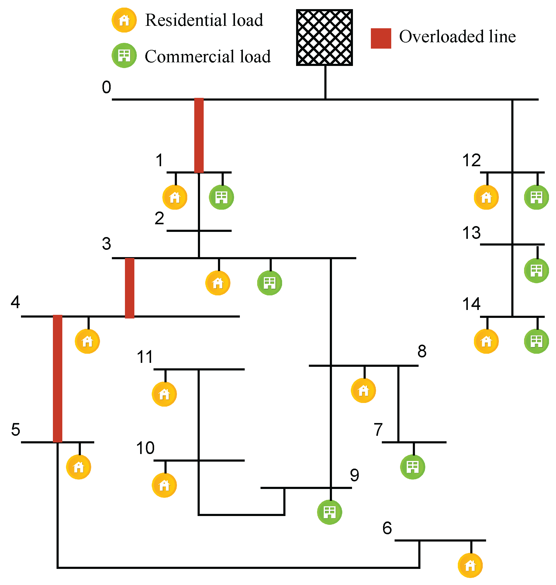 Figure 1. This schematic also illustrates the existing issues within the network. The minimum voltage limit is set at 0.90 pu, based on the IEC 60038 standard for medium-voltage systems. Information on the nominal power, location, and type of loads is provided in [