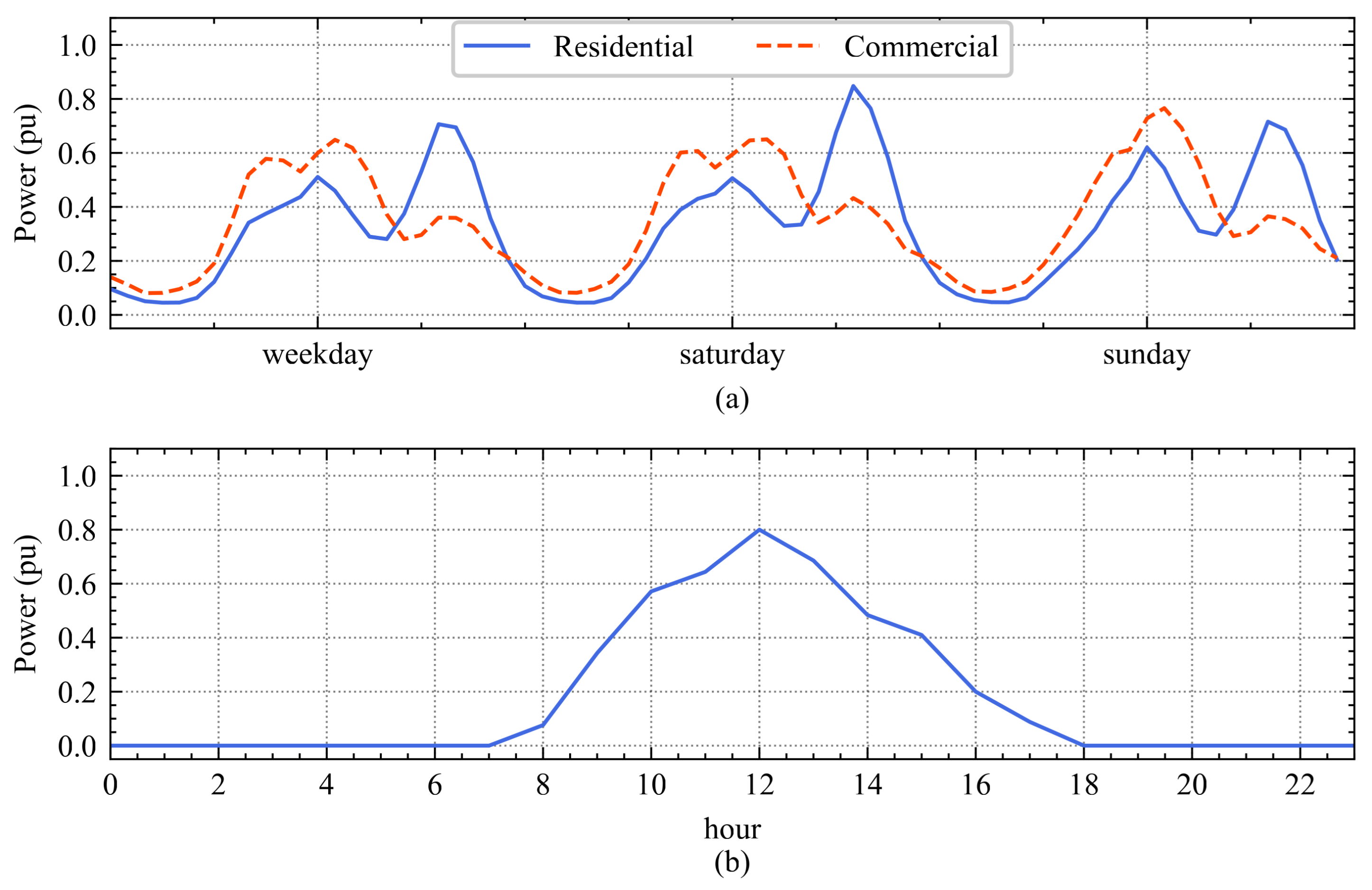 Figure 2 shows the profiles of residential and commercial use (a). The availability profile of photovoltaic generation considered for installation is also shown (b). A daily profile is presented, which is considered the typical generation pattern for winter and, for simplicity, is repeated cyclically throughout the entire analyzed period. These are the two uncertain parameters considered in this study. A total of five representative days are considered: three weekdays and two weekend days (Saturday and Sunday). The analysis is carried out with hourly resolution. In total, the analysis period is defined as the set
