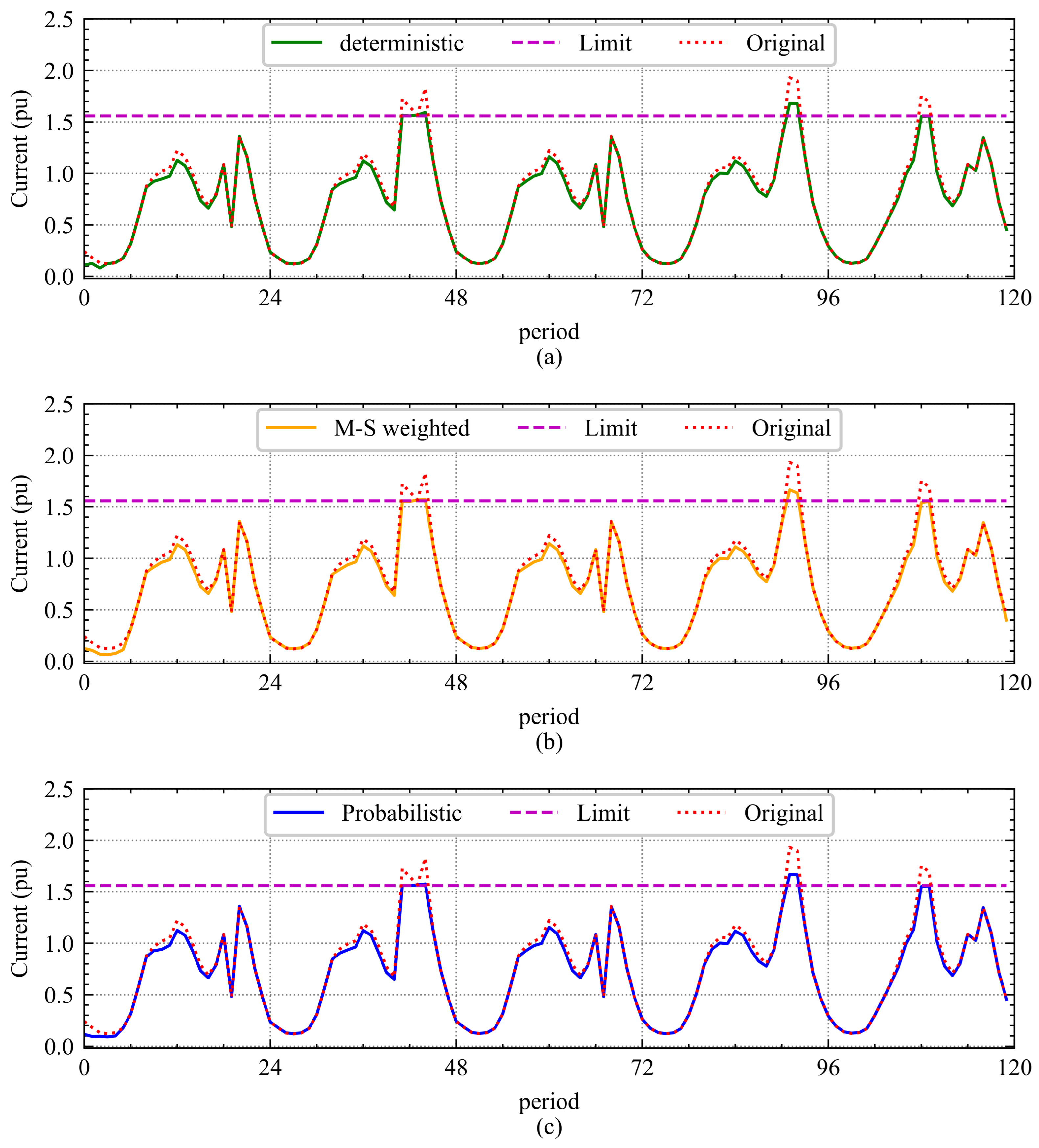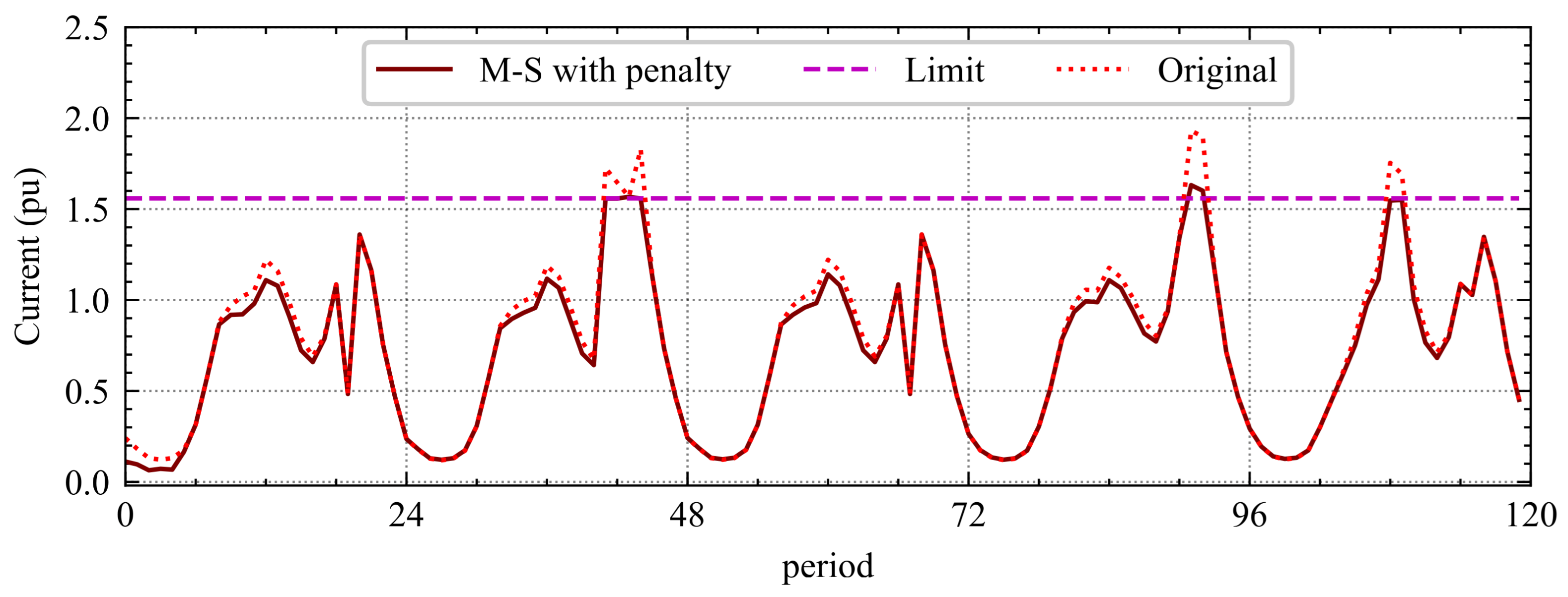 Figure 3 illustrates the evolution of the currents along the originally overloaded line 0–1 and how the problems are corrected according to each methodology.