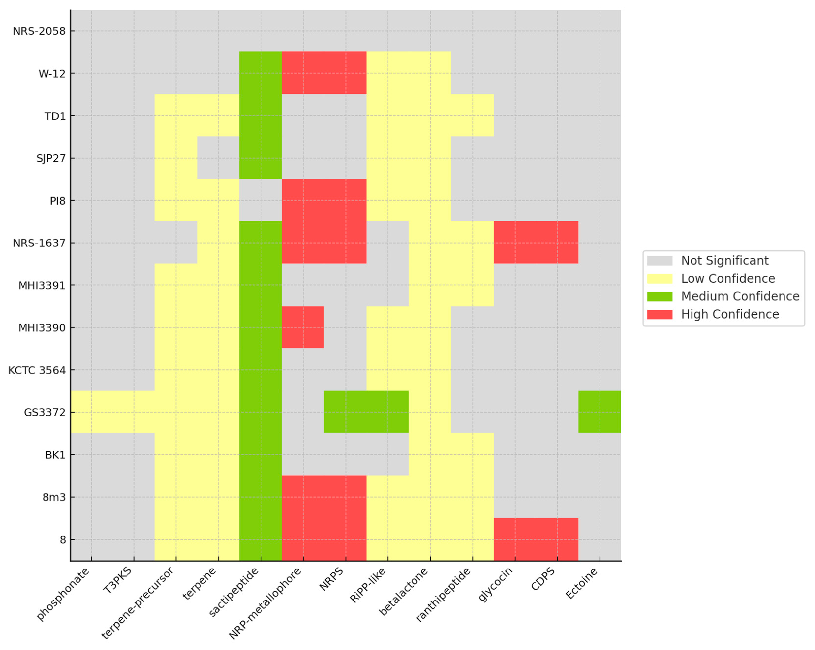 - Medema, M.H.; Blin, K.; Cimermancic, P.; De Jager, V.; Zakrzewski, P.; Fischbach, M.A.; Weber, T.; Takano, E.; Breitling, R. antiSMASH: Rapid identification, annotation and analysis of secondary metabolite biosynthesis gene clusters in bacterial and fungal genome sequences. Nucleic Acids Res. 2011, 39, W339–W346. [Google Scholar] [CrossRef]