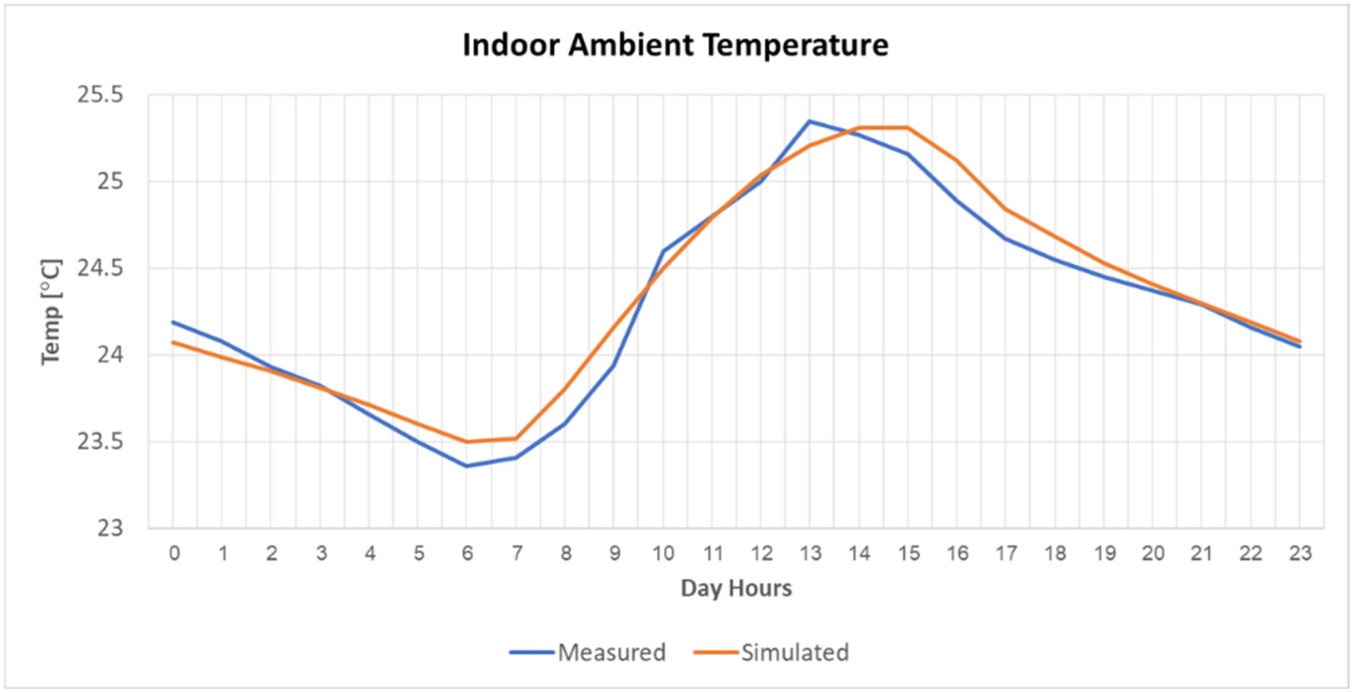 Throughout the results, a clear distinction is made between measured data and simulated outcomes. Empirical measurements reflect actual classroom conditions under typical operation, including irregular HVAC usage and occupancy-driven fluctuations. Simulated scenarios, by contrast, were constructed under controlled boundary conditions to assess the isolated and combined impact of envelope insulation and night ventilation. These simulations, calibrated using real data, allow for predictive comparisons and scenario testing while maintaining fidelity to observed behavior.