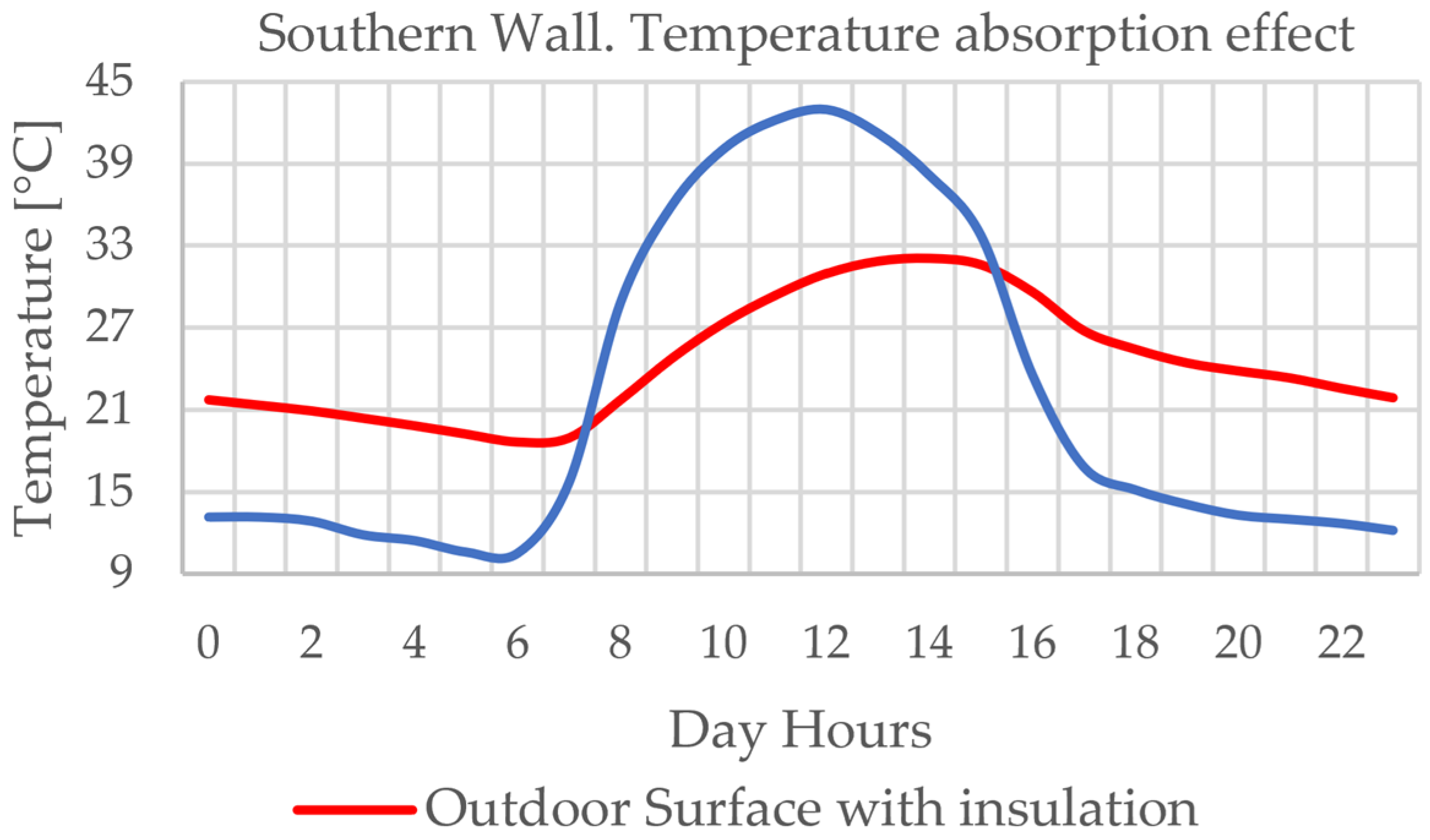 The data show a pronounced asymmetry between the walls. The southern wall, heavily exposed to solar radiation during the day, exhibits significantly higher surface temperatures compared to the northern wall. This thermal disparity complicates maintaining a uniform indoor temperature, as heat accumulation varies by orientation.