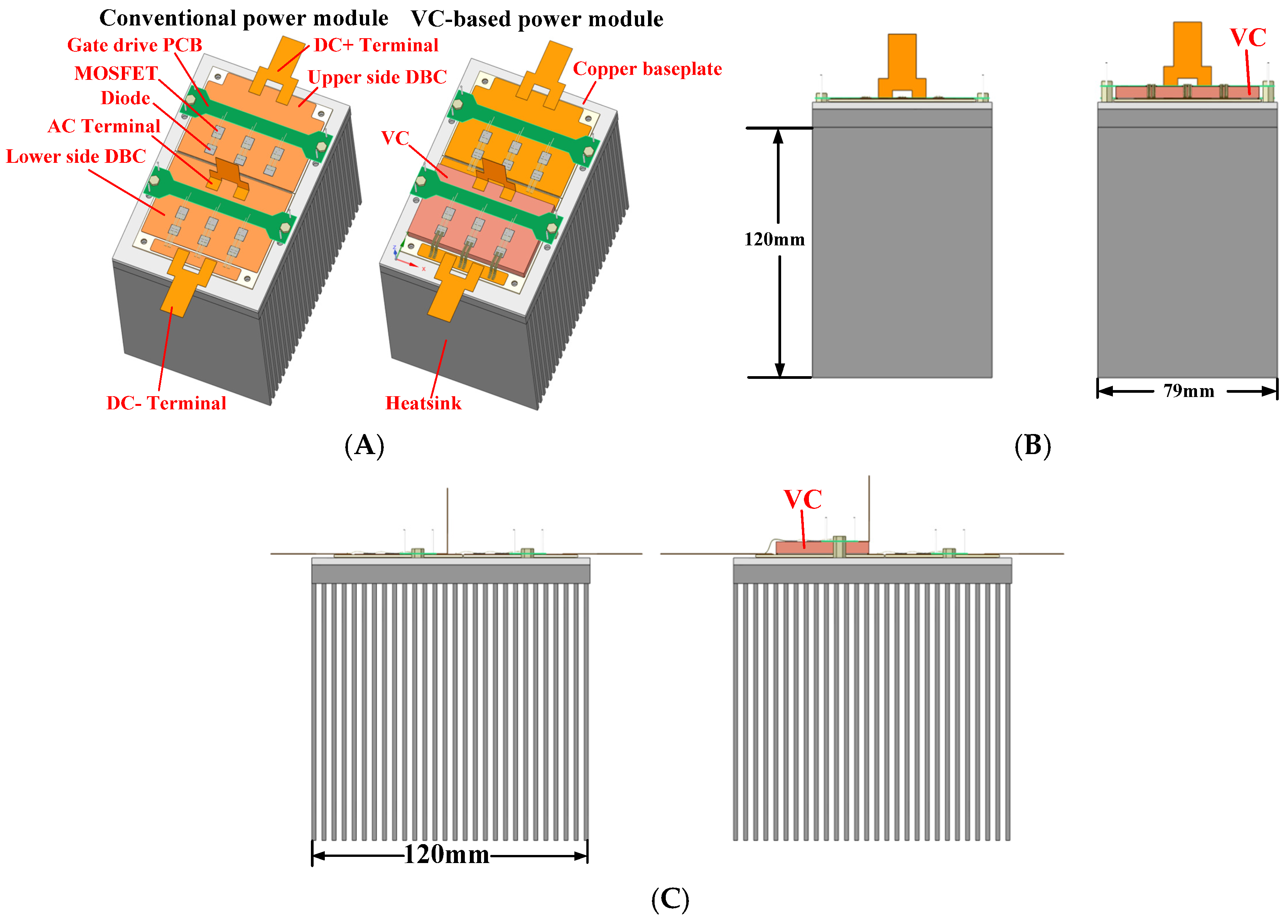 - Wang, B.; Wang, L.; Wu, S.; Hou, Z.; Mu, W.; Yang, F.; Liu, J.; Gan, Y. An Evaluation on Thermal Performance Improvements for SiC Power Module Integrated with Vapor Chamber in MMC. IEEE J. Emerg. Sel. Top. Power Electron. 2022, 10, 5214–5225. [Google Scholar] [CrossRef]