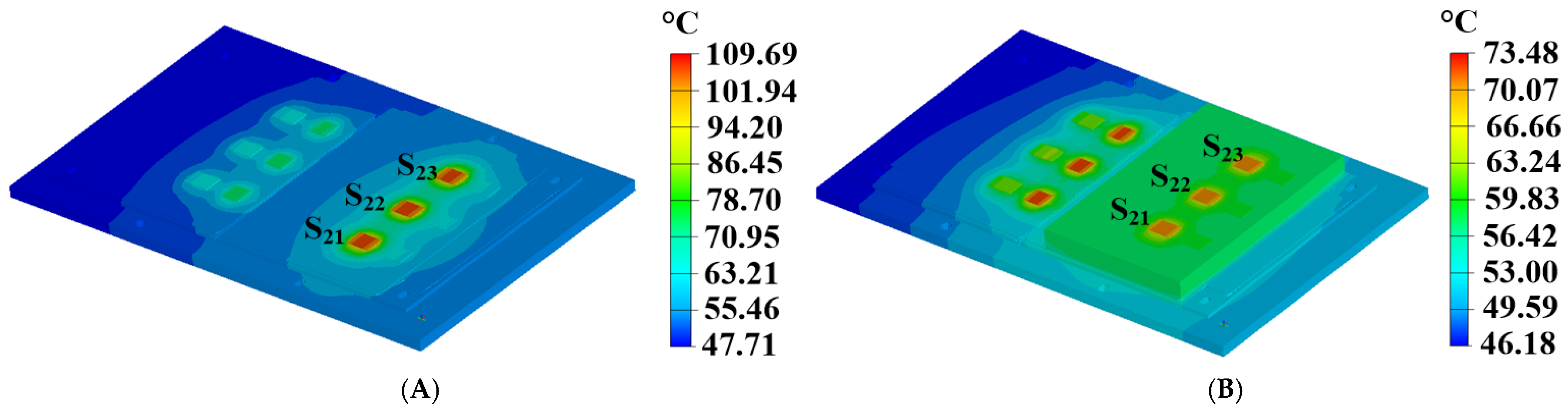 - Zhang, C.; Ge, X.; Lin, C.; Luo, D.; Wang, H.; Xiao, X. Optimization and Analysis of Thermal Conductivity Structure for IGBT Module Embedded with the Vapor Chamber. IEEE Trans. Compon. Packag. Manuf. Technol. 2023, 13, 798–807. [Google Scholar] [CrossRef]