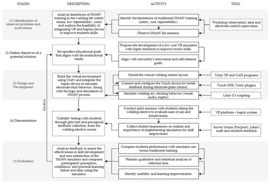 This research proposes the development of a haptic virtual reality simulator that imitates the conditions of a Shielded Metal Arc Welding (SMAW) workshop and aims to enhance the psychomotor training of mechanical engineering students at the Pontificia Universidad Católica de Valparaiso. To guide the research and development process, the Design Science Research Methodology (DSRM) was used, as it offers a structured framework for building and evaluating innovative technological solutions. The process followed these five key stages: (1) Identification of observed problems and motivations; (2) definition of objectives for a potential solution; (3) design and development of the simulator; (4) demonstration through student interaction; and (5) evaluation based on user perception. Figure 1 shows the stages, activities, and tools needed to carry out this project.