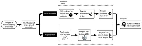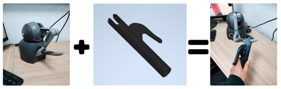 The technological solution consisted of a virtual reality welding simulator with haptic feedback. To do so, two development tracks were defined: one for the integration of a haptic system and another for the construction of the virtual environment. In the haptic system track, a Touch device from 3DSystems was used, as shown in Figure 3, to simulate tactile feedback during electrode–plate interactions and movement control of the electrode holder. This last one was designed so it can adapt to the Touch device, and 3D-printed to emulate the geometry of a real welding tool (see Figure 3).