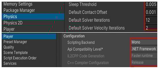 Specifically, the default contact offset, solver iterations, and solver velocity iterations were adjusted as specified by the haptic device supplier. The Api Compatibility level was changed from .NET Standard 2.1 to .NET Framework for a better library compatibility as this option is ideal for developments that require complex native libraries.