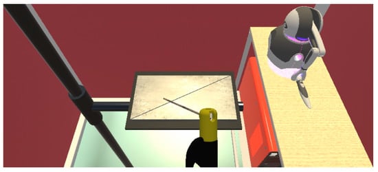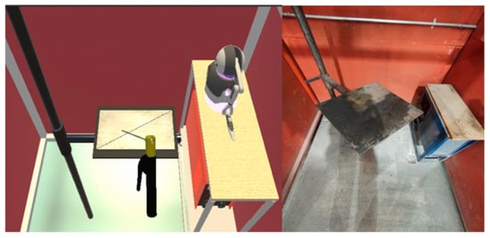 The main camera shows the user’s point of view and remains static throughout the simulation. Its position emulates the visual perspective of a welder inside a real welding booth in the university laboratory; Figure 5 shows the comparison of the real cabinet and the virtual one.