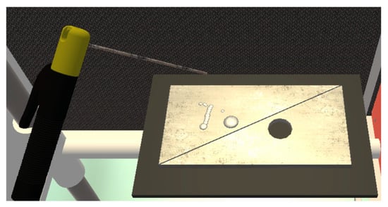 The use of additive manufacturing in this stage follows the principles described by Chong et al., 2018, where 3D-printed components enhance realism and conceptual understanding by enabling rapid prototyping of custom teaching aids, as well as facilitating iterative design adjustments in response to user feedback []. The printed electrode holder was coupled to the Touch and then its virtual model was integrated into the simulation environment, allowing for accurate spatial alignment between the physical haptic device and its digital counterpart and contributing to higher immersion [].