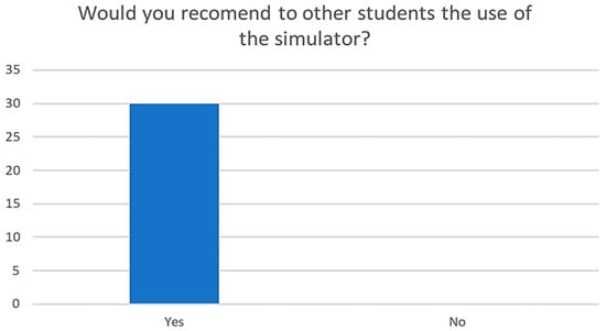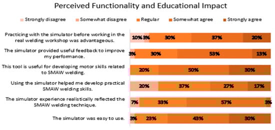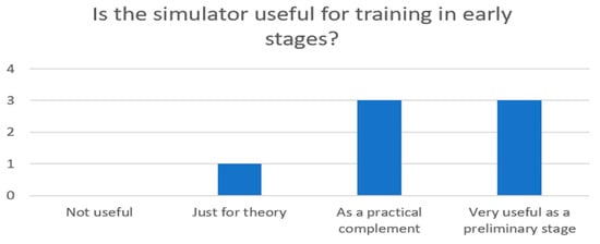 In addition, the simulator’s value for early-stage training was questioned. As shown in Figure 19, six of seven agreed that it was very useful as a preliminary step or as a practical complement to actual welding, while only one considered it to be merely theoretical. None considered it useless. This validates the tool’s role in bridging the gap between theoretical knowledge and hands-on practice.