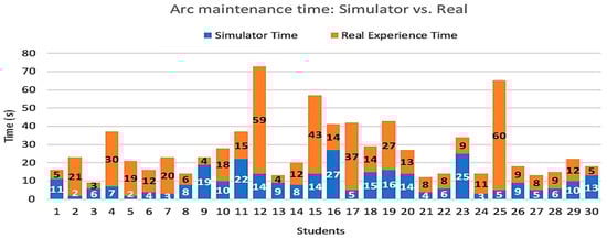 Arc maintenance times were generally shorter and more consistent in the simulator compared to real practice. The mean duration achieved in the simulator was 10.07 s (as shown in Table 4), while in the real workshop it increased to 17.17 s, representing a 50.7% longer average time when performing the task in a live welding environment. The real experience results show high variability, with participants exceeding 30 s and even peaking close to 60 s. These longer durations may be attributed to factors such as initial hesitation, lack of motor control, or difficulties in arc ignition, all of which are accentuated in a live welding environment due to stress, limited visibility, and safety constraints.