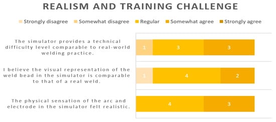 - Visual realism: Four users rated the visual representation of the weld bead as “regular” and two as “somewhat agree”, with one “strongly disagreeing”. This highlights a design opportunity to improve the graphical fidelity of bead formation and heat-affected zones for better representation.