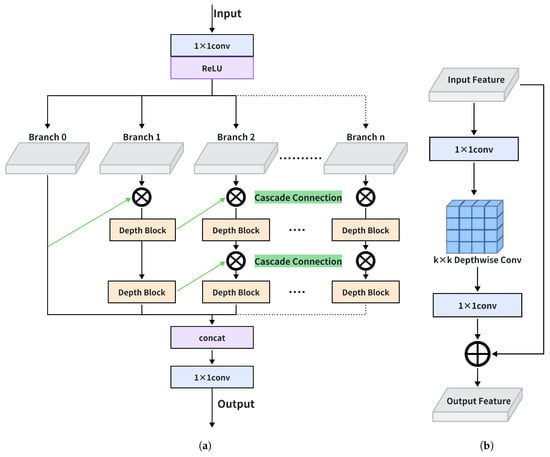 Figure 3a depicts the Multi-Branch Feature Fusion (MBFF) module’s four-stage operational workflow: initial feature projection, depth block operation, cascade feature fusion, and final feature aggregation. The detailed mathematical formulation is presented as follows.