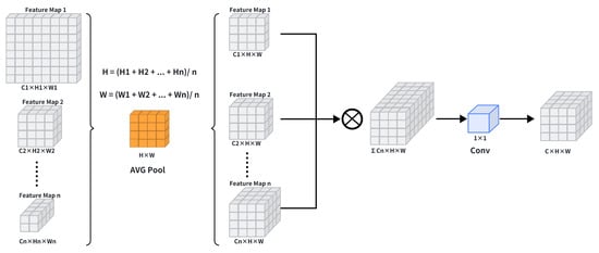 - Feature Downsampling: Input feature maps (e.g., P4 level from Backbone) undergo downsampling via Adaptive Average Pooling []. The pooling kernel size is dynamically adjusted based on spatial characteristics of input features, formulated as follows:where denotes the input feature. This operation reduces spatial dimensions (, e.g., from to ) while preserving the channel count (C) to mitigate information loss.