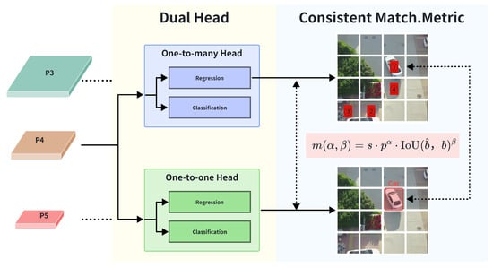 The traditional YOLOv8 detection head shows obvious limitations in multi-scale feature fusion and contextual inference, especially in the final stage of inference, which requires the use of Non-Maximal Suppression (NMS) to remove redundant prediction frames, which increases inference latency and requires continuous tuning of its parameters. To address these challenges, we design the Dual-Stream Head with reference to the Consistent Dual Assignments [] training strategy, which fundamentally solves the problem of NMS dependency in inference through dual-branch processing and end-to-end optimization []. Unlike YOLOv8’s single-branch approach and mandatory Non-Maximal Suppression (NMS), as revealed in Figure 5, the Dual-Stream Head introduces a dual-head architecture consisting of two functionally specialized components: a one-to-many head, which is enriched by multi-prediction assignment []) to enrich training supervision; and a one-to-one head (One-to-One Head), which implements NMS-free inference. Both “heads” are based on enhanced multi-scale features generated by a backbone network containing large-kernel convolution (7 × 7) and partial self-attention (PSA) mechanisms for long-distance dependency modeling, followed by a neck module combining spatial pyramid pooling (SPP) and a path aggregation network (PAN) for cross-scale P3 (1/8), P4 (1/16), and P5 (1/32) context integration. This structural innovation allows each scale to specialize in specific object sizes—high-resolution P3 features excel at detecting small objects, P4 balances medium-sized targets, and coarse-grained P5 captures large objects—addressing a critical weakness in YOLOv8’s scale-agnostic processing.