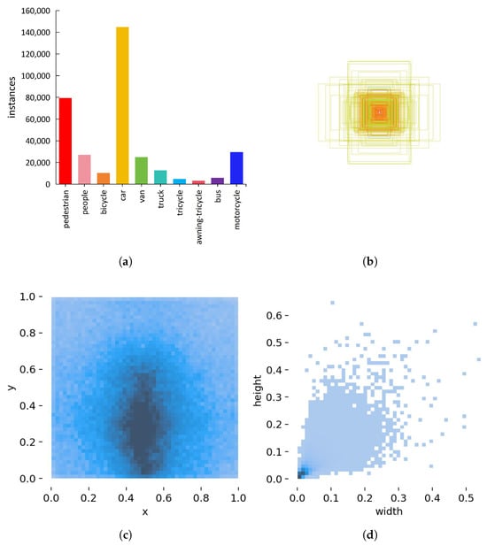 The VisDrone2019 dataset, a large-scale collection of UAV-captured aerial images, was created by the AISKYEYE team from Tianjin University in 2018. Data acquisition spanned 14 different cities in China. This benchmark comprises ten distinct object classes: pedestrian, people, bicycle, car, van, truck, tricycle, awning-tricycle, bus, and motorcycle. As revealed in Figure 6, the dataset exhibits significant class imbalance: instances of “pedestrian” and “people” vastly outnumber other categories. Targets are predominantly small-scale, with bounding-box size distributions indicating an exceptionally high proportion of minute objects. Spatial analysis reveals non-uniform distribution of target centers across the image plane, where heatmaps highlight dense concentration in central regions. Furthermore, scatter plots of target width versus height demonstrate a strong positive correlation, indicating that objects generally exhibit regular or near-square aspect ratios. Consequently, VisDrone2019 imposes heightened demands on models to detect small-scale, center-clustered targets in urban scenarios under UAV top-down perspectives. Moreover, the extensive variety and intricacy of the scenes (Figure 7) establish a solid basis for assessing model robustness under demanding real-world conditions.