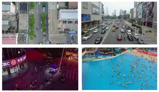 Unmanned Aerial Vehicles (UAVs), also known as drones, are unpiloted aircraft operated remotely or autonomously via integrated program systems []. Equipped with high-resolution cameras and intelligent algorithms, they enable dynamic monitoring and data collection of ground-based targets. Compared to traditional satellite remote sensing or ground-based photogrammetry, UAVs offer distinct advantages. First, they feature lower operational costs and faster data acquisition capabilities, allowing for real-time capture of high-quality imagery. Second, UAVs possess high maneuverability, enabling them to perform missions effectively in complex environments, such as densely built urban areas or disaster sites. Finally, their high-resolution imaging capability (typically reaching approximately 2000 × 1500 pixels) establishes a foundation for fine-grained target identification []. These advantages have led to the widespread application of UAVs across various fields, including traffic supervision, urban planning, agricultural monitoring, power line inspection, and emergency disaster response [].