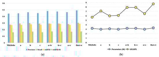 To evaluate the model’s performance, the standard metrics of Precision (P), Recall (R), Average Precision (AP), and mean Average Precision (mAP) were adopted for assessing detection accuracy. Computational efficiency was gauged using parameters and GFLOPs [].