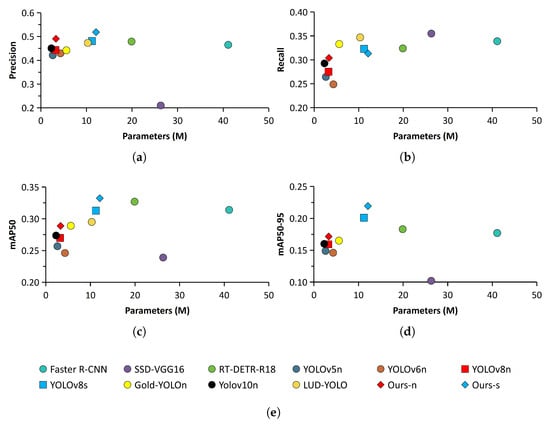 Analysis of comparison experiment results. (a) Parameter–Precision scatter plot comparison. (b) Parameter–Recall scatter plot comparison. (c) Parameter–mAP50 scatter plot comparison. (d) Parameter–mAP50-95 scatter plot comparison. (e) Distribution of legend.