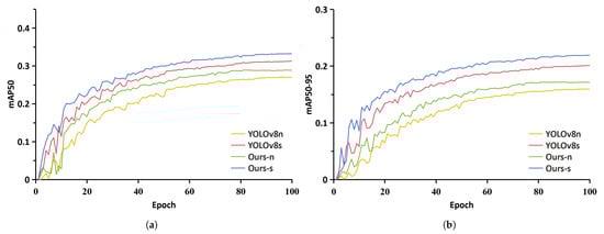 For the visual verification of the proposed algorithm’s optimized performance, a training comparison was carried out on the VisDrone2019 dataset between the two configurations of the MBD-YOLO framework (Nano and Small) and the reference models YOLOv8n and YOLOv8s, emphasizing the mAP50 and mAP50-95 metrics. As shown in Figure 10, both variants of MBD-YOLO consistently exceed the baseline models across all training epochs in terms of mAP50 and mAP50-95, conclusively demonstrating the enhanced capability of the proposed model in object detection.