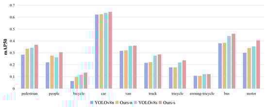 To validate MBD-YOLO’s detection performance across different target categories in the VisDrone2019 dataset, we compared its Nano and Small variants with baseline models (YOLOv8n/YOLOv8s) under identical conditions, analyzing model parameters and per-category mAP50. As shown in Table 4 and Figure 11, both MBD-YOLO versions surpassed their baselines in mAP50 across all ten categories. Specifically, MBD-YOLO-Nano achieved significant gains for small targets: pedestrians (+17.96%), people (+25.91%), and bicycles (+55.56%); moderate improvements for medium targets: cars (+0.48%), vans (+1.26%), and motorcycles (+12.96%); and enhanced detection of large targets: trucks (+2.78%) and buses (+1.32%). Similarly, MBD-YOLO-Small excelled in small-target categories: pedestrians (+7.29%), people (+15.97%), bicycles (+15.52%), and tricycles (+8.72%); showed robust performance for medium targets: cars (+1.42%), vans (+0.56%), and motorcycles (+13.80%); and showed improved accuracy in detection of large targets: trucks (+3.99%) and buses (+4.30%). These results demonstrate MBD-YOLO’s comprehensive optimization, dramatically boosting small-target detection while consistently enhancing medium- and large-target recognition.