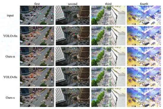 In the first column’s intersection scene, camera vibration induced focal instability, resulting in severe loss of texture details and blurred target contours. For the second column’s aerial urban scenario, spatial occlusion from dense building clusters created alternating highlight and shadow zones, destabilizing color and luminance feature distributions. Concurrently, static interferences—such as curtain wall reflections and outdoor AC units—exhibited morphological similarities to target vehicles, significantly increasing false detection risks. In the third column’s complex street scene, overlapping multi-category targets (e.g., bicycles and cars) with blurred boundaries and uneven spatial distribution caused feature representation conflicts and classification interference. The fourth night-time scenario relied on high-luminosity features from vehicle lights and reflective markers, yet edge details were compromised by streetlight glare and headlight halo effects.