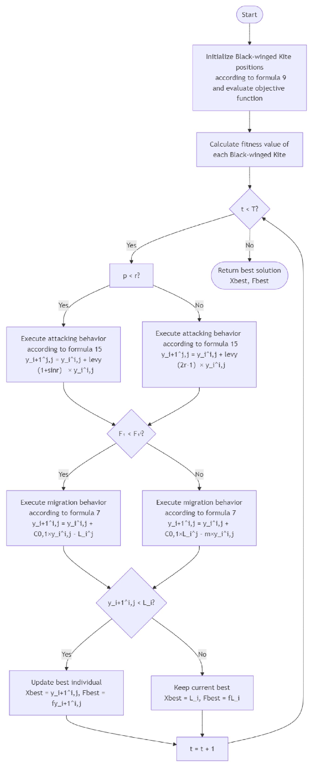 19]. Furthermore, this approach has been successfully applied to the training process of neural networks. With the continuous development of meta-heuristic algorithms, swarm intelligence optimization algorithms—similar to evolutionary computation—draw inspiration from the social behaviors of biological organisms to simulate various collective behaviors. Examples include the Gray Wolf Optimizer (GWO), Whale Optimization Algorithm (WOA), and Dung Beetle Optimizer (DBO). Such algorithms have been widely used in various fields, such as energy-efficient train operation, fault detection, and network optimization. The Black-winged Kite Algorithm (BKA) is a novel swarm intelligence optimization algorithm proposed in 2024 [