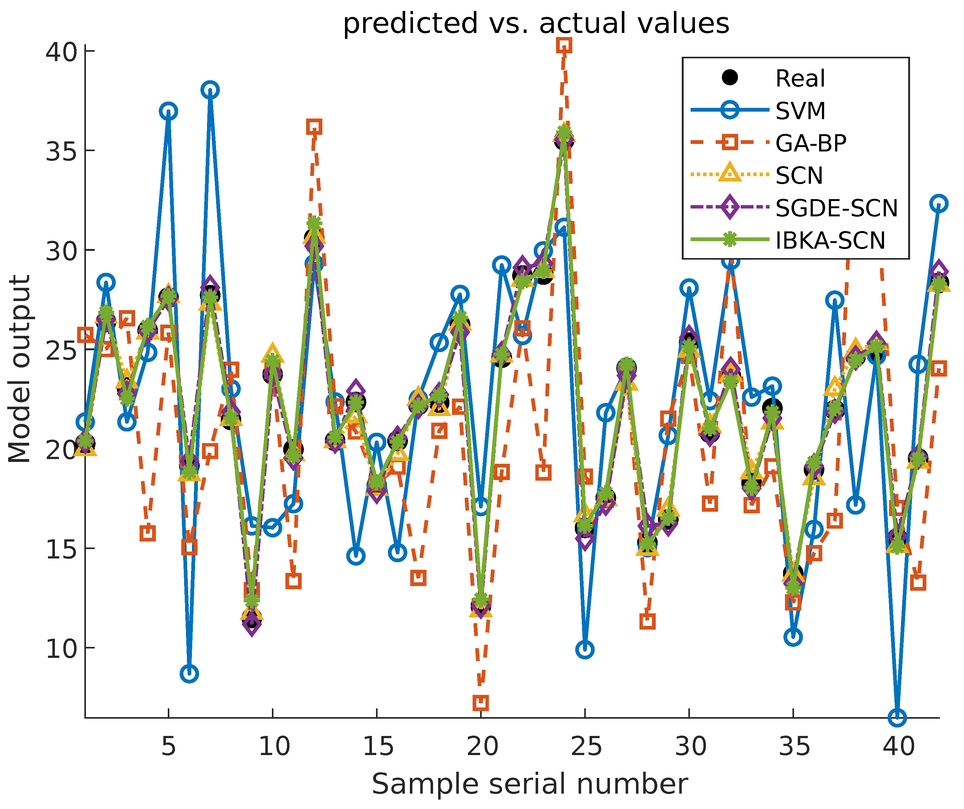 components. To validate the effectiveness of the proposed IBKA-SCN model, its performance was compared with several commonly used modeling methods for component content prediction, including SVM, GA-BP, SCN, and SGDE-SCN. Among the 200 collected samples, 80% were randomly selected as the training set