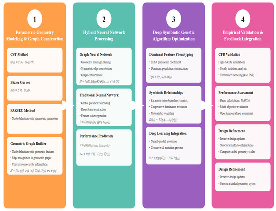 Airfoil design optimization represents a critical challenge in aerodynamic engineering, requiring the simultaneous consideration of complex geometric parameters, fluid dynamics principles, and multi-objective performance criteria [1]. Traditional optimization approaches face fundamental limitations: computational fluid dynamics (CFD) simulations demand extensive resources, parametric design spaces exhibit high dimensionality with non-convex characteristics, and conventional genetic algorithms lack intelligent guidance mechanisms for efficient convergence [2,3]. Recent advances in machine learning have introduced promising solutions through physics-informed neural networks [1], multi-fidelity optimization [4], and deep learning-enhanced evolutionary algorithms [2]. However, these approaches address individual aspects of the optimization challenge in isolation. Liu et al.’s CNN-PINN-DRL framework [1] successfully integrates physics constraints with neural networks but lacks geometric relationship modeling. Wu et al.’s multi-fidelity approach [4] achieves computational efficiency through intelligent data fusion yet does not exploit parameter interdependencies. Similarly, existing evolutionary methods treat design parameters independently, missing critical symbiotic relationships that emerge in optimal airfoil configurations [2,5].