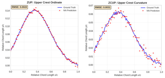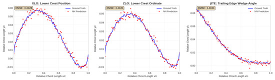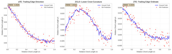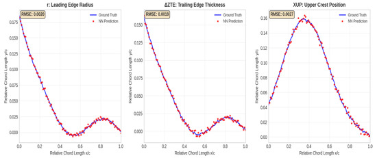 Figure 4 represents the results for the leading edge radius (r), trailing edge thickness (ΔZTE), and upper crest position (XUP), showing excellent correlation between ground truth and neural network predictions. The RMSE values of 0.0018 for ΔZTE and 0.0021 for r confirm the framework’s superior capability in capturing critical geometric features that significantly influence airfoil performance. This aligns with the attention weight hierarchy, where r (0.1847) and ΔZTE (0.1623) received the highest importance rankings, validating the model’s physics-informed learning approach.