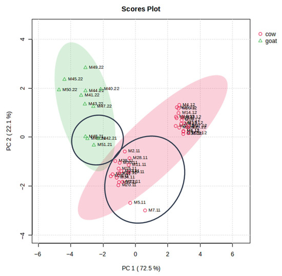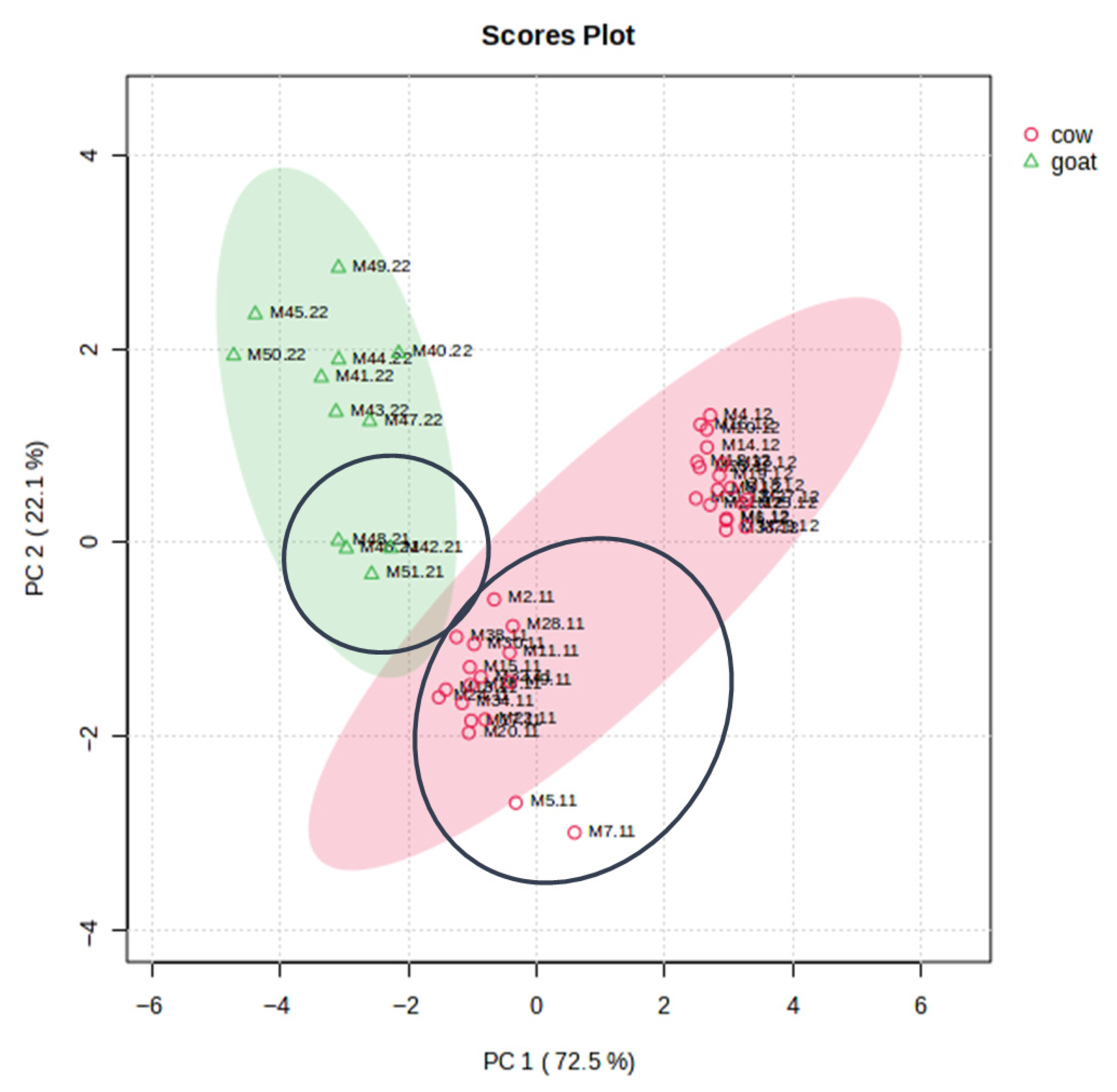 3.5.1. Comparative Analysis of Cow and Goat Milk