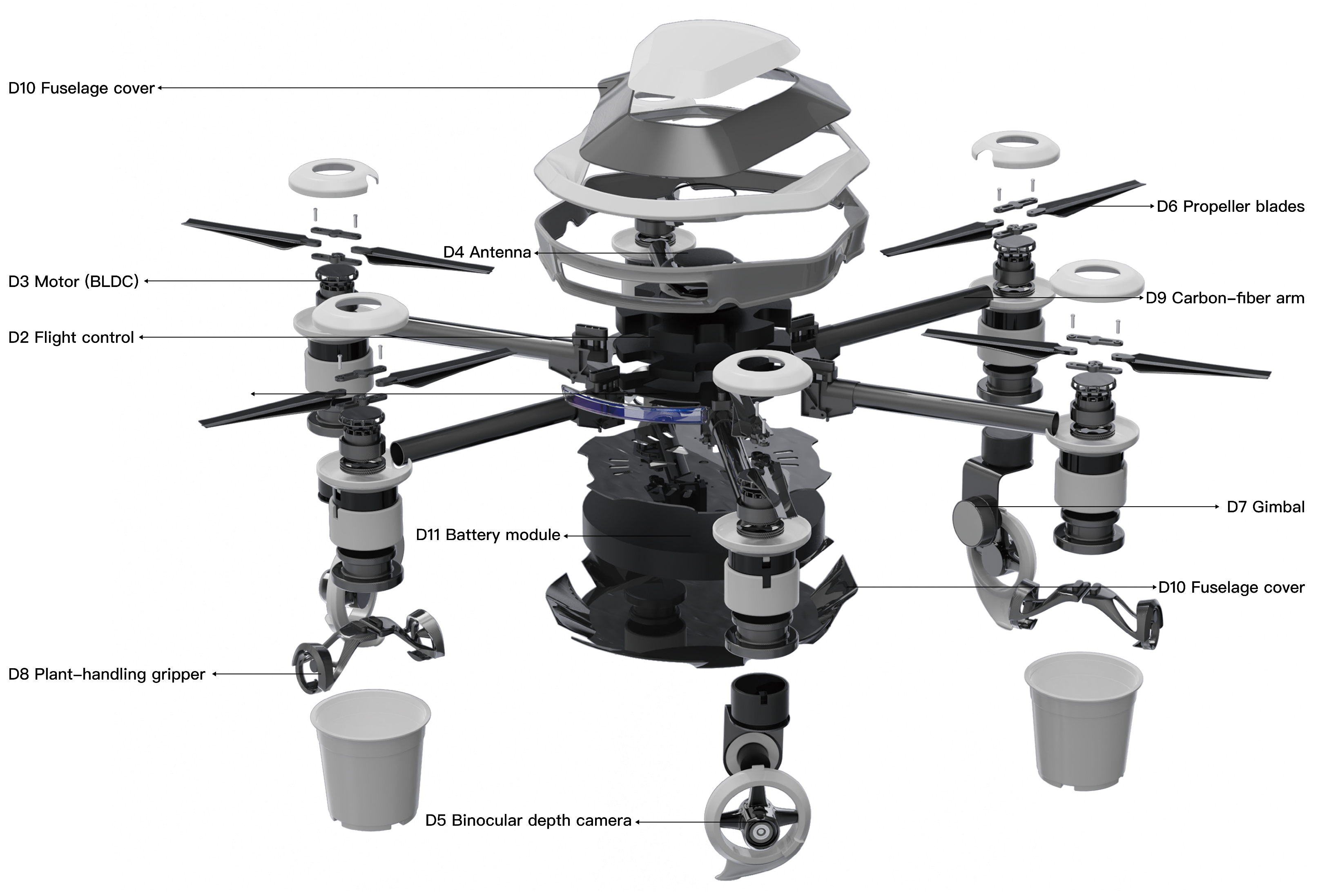 | D10 | Fuselage cover | CFRP laminate; optional ABS trims | Aerodynamic/protective cover |