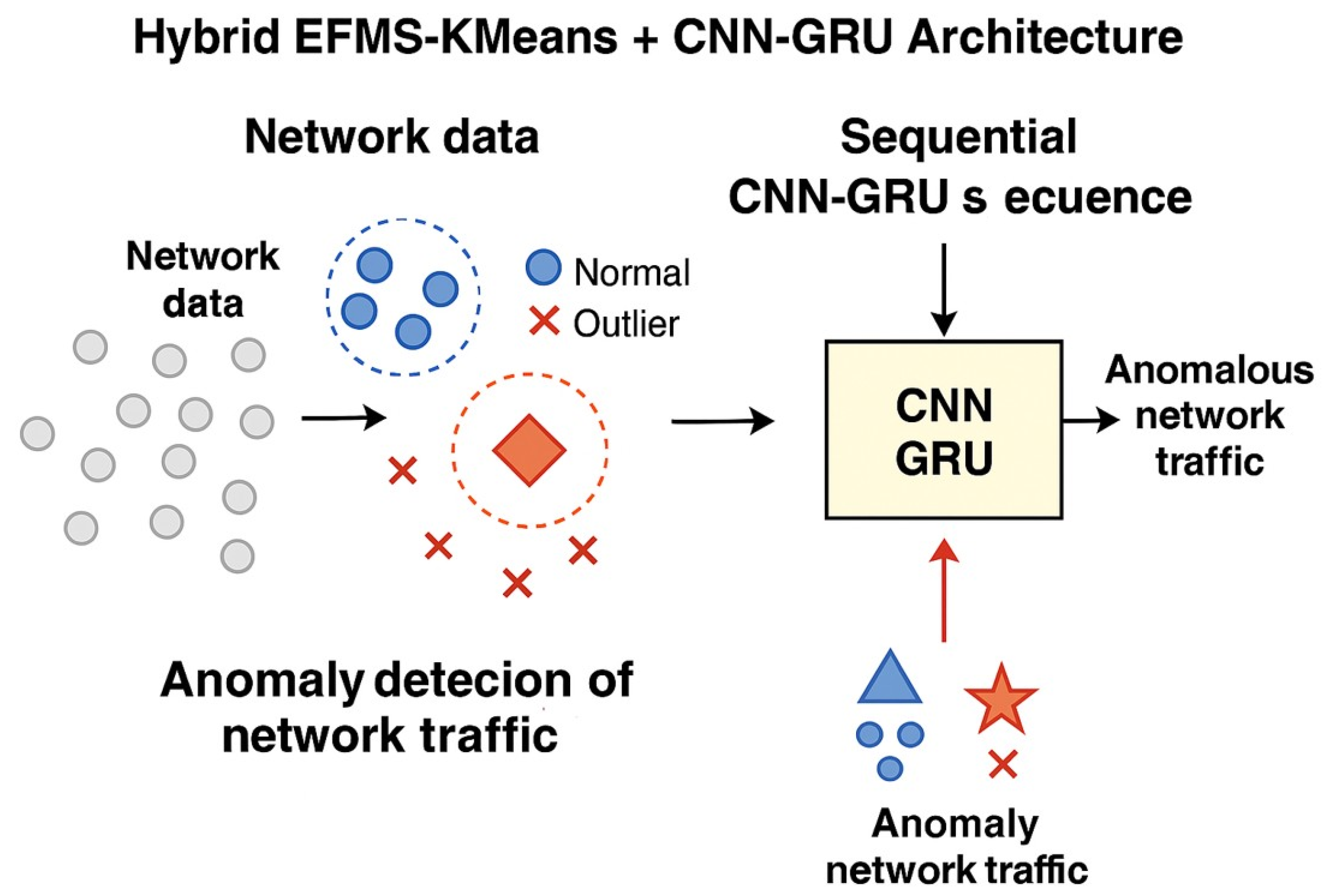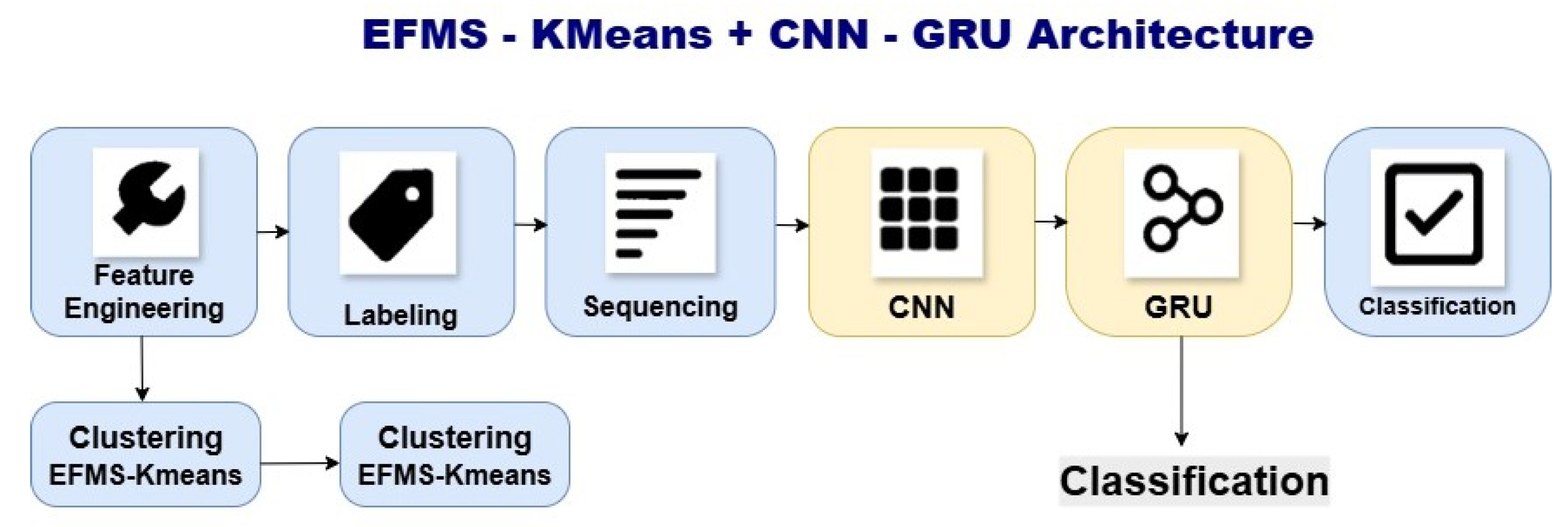 Novel hybrid architecture: We propose an architecture that integrates EFMS-KMeans pre-clustering with a sequential CNN-GRU classifier, combining the strengths of unsupervised segmentation with deep sequential modeling. This integration enables the detection of anomalous traffic patterns in heterogeneous and large-scale environments, providing greater robustness against the dynamic nature of encrypted network traffic.