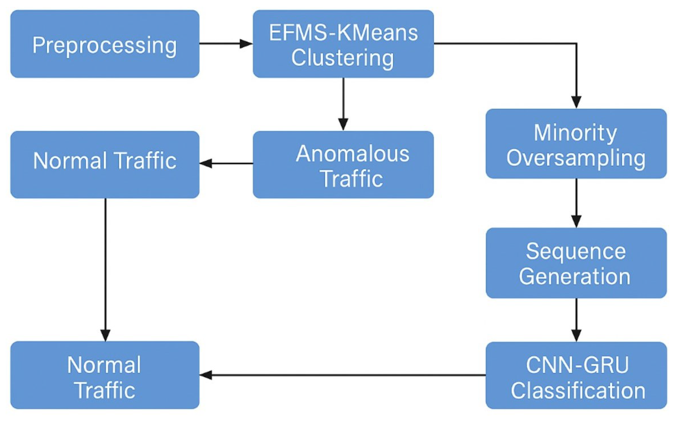 This clustering stage provides a robust unsupervised mechanism for anomaly detection, generating preliminary labels that are later leveraged by the supervised CNN-GRU model. By combining EFMS with K-Means, the methodology achieves a balance between computational efficiency and improved cluster stability, which is particularly relevant in heterogeneous and imbalanced traffic scenarios.