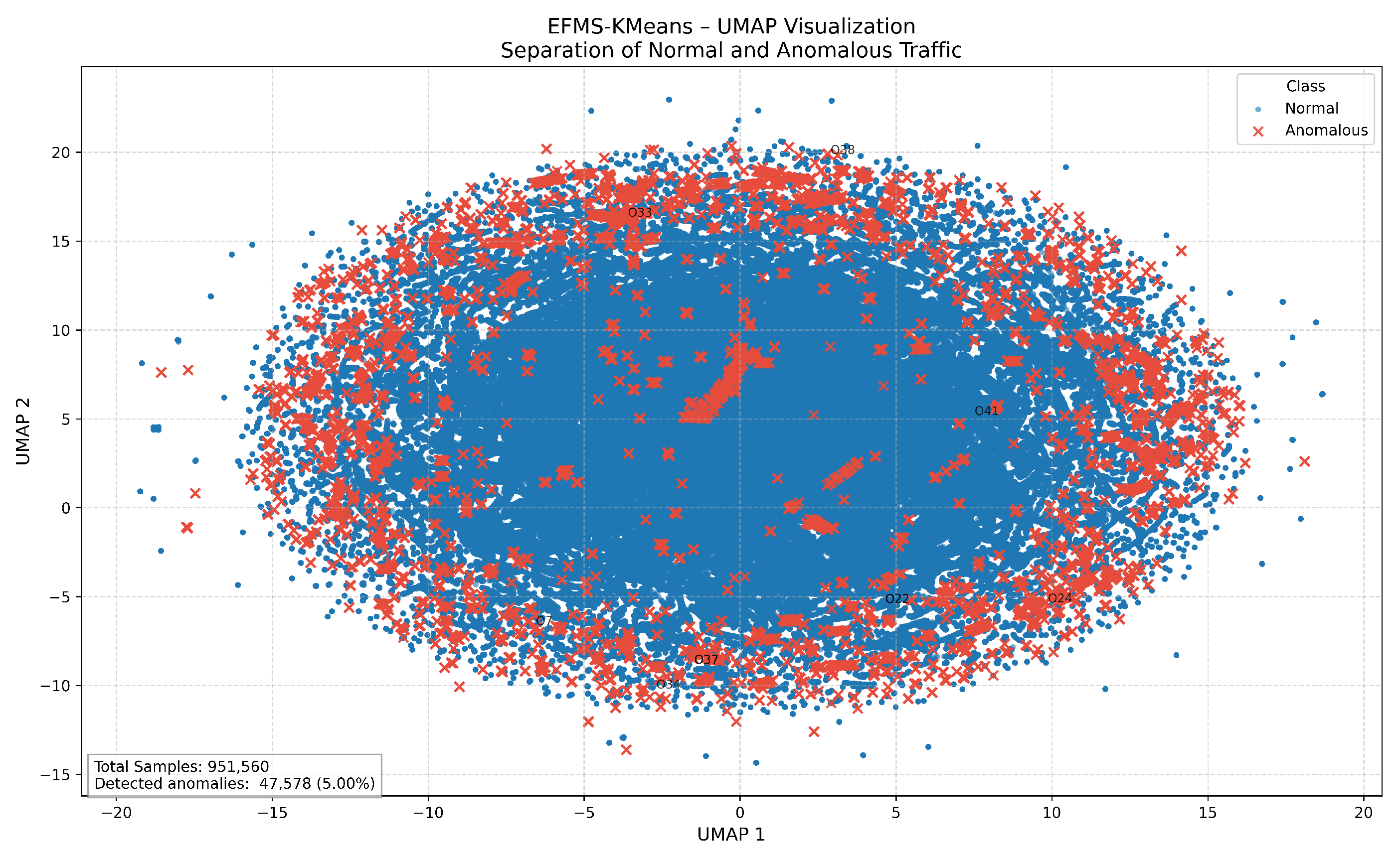 Figure 5, the UMAP projection of the feature space after clustering provides a two-dimensional visualization that highlights the distribution of normal and anomalous traffic samples. Each blue dot represents a normal flow, while red markers denote anomalous instances identified through the EFMS-KMeans process. This visualization was generated using the