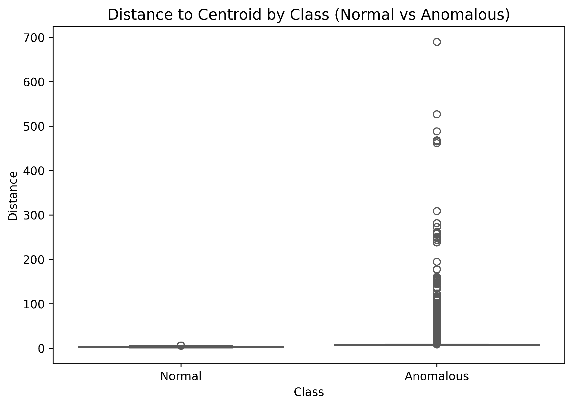 Figure 7 presents the boxplot of distances to cluster centroids for both normal and anomalous traffic. The distribution clearly shows that normal flows (left) concentrate around lower distance values with few outliers, while anomalous flows (right) exhibit markedly higher dispersion and extreme values exceeding 600 units. The median shift and the broader interquartile range observed in the anomalous class confirm a statistically significant separation between the two groups. This evidence reinforces the validity of the adopted segmentation criterion, as anomalous traffic consistently lies farther from the cluster centroid, supporting its characterization as structurally distinct in the feature space.