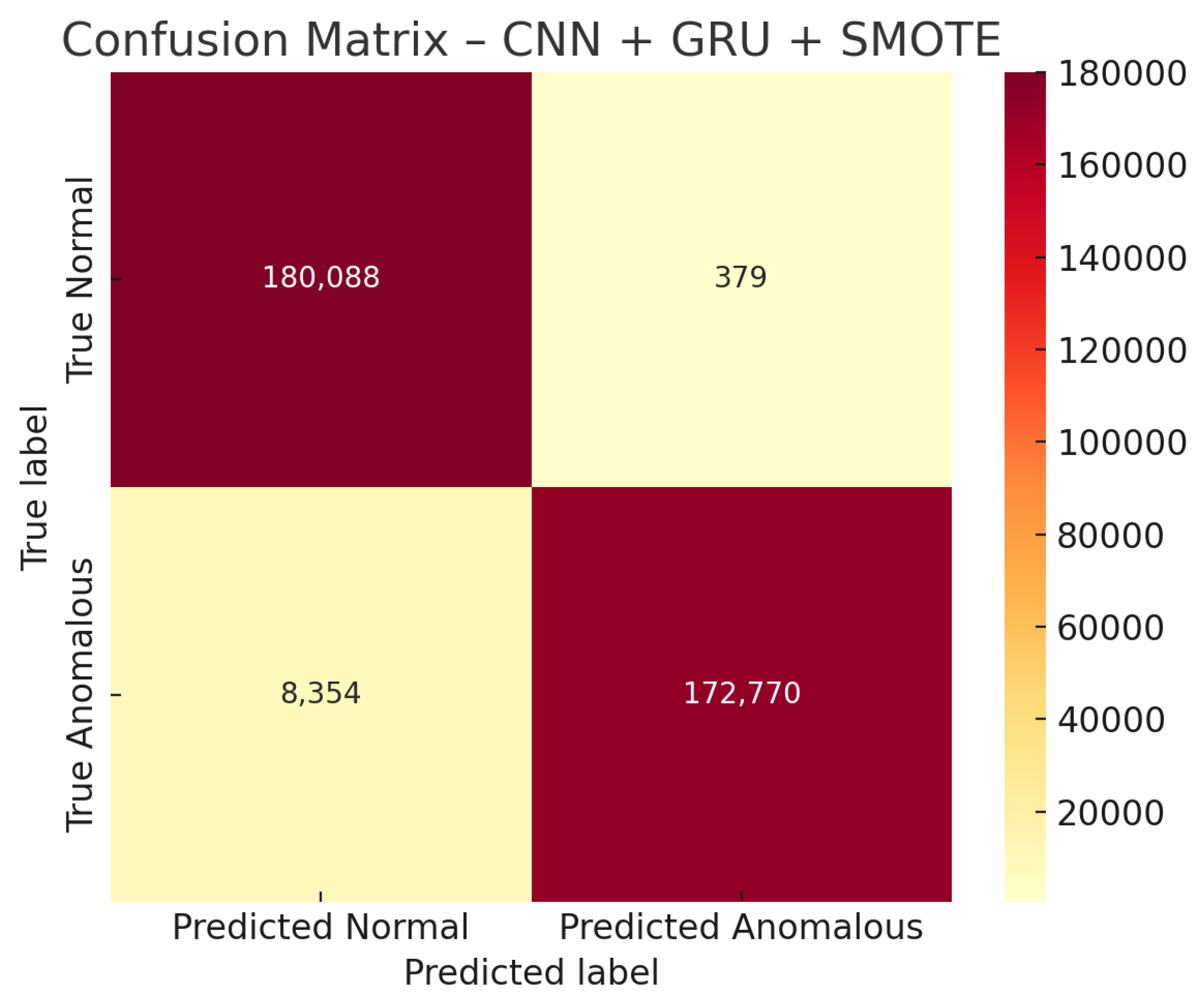 Figure 9) highlights the robustness of the proposed CNN–GRU classifier combined with SMOTE. Out of more than 361,000 test samples, the model correctly classified 180,088 normal flows and 172,770 anomalous flows, yielding only 379 false positives and 8354 false negatives. This performance reflects a very low false-positive rate, which minimizes unnecessary alerts, and a reduced false-negative rate, which is critical in cybersecurity environments where undetected threats represent the highest operational risk. These results confirm that the model achieves a favorable balance between sensitivity and specificity, ensuring both accuracy and practical reliability for real-world deployment.
