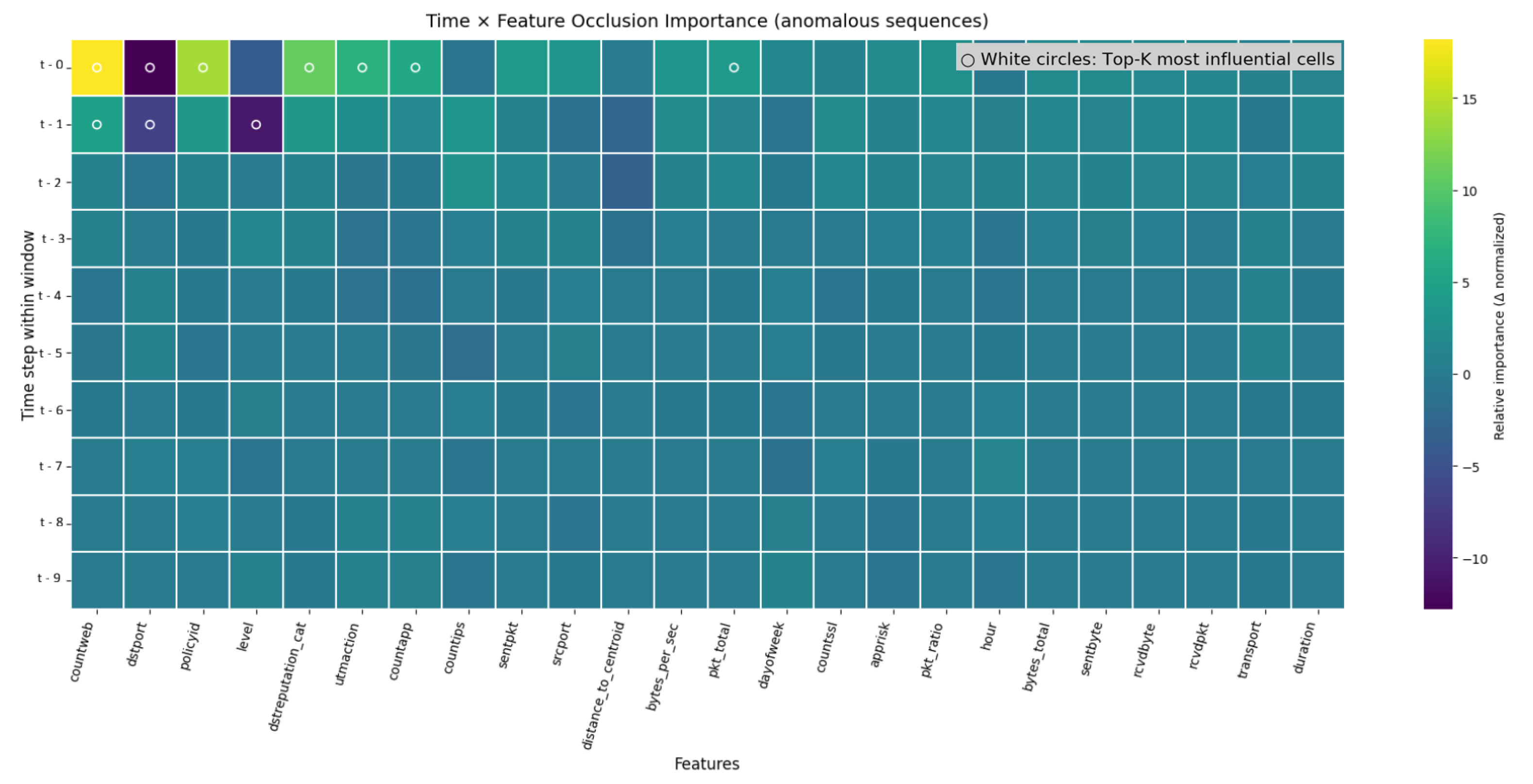 normalized) aggregated across the temporal window. Whereas the heatmap provides a fine-grained view of how each feature contributes at specific time steps, the table highlights which features are globally most relevant within the anomalous sequence. Both perspectives are fully consistent, as they derive from the same occlusion analysis but emphasize different dimensions: the temporal dynamics (heatmap) versus the overall magnitude of contribution (table). In the heatmap,