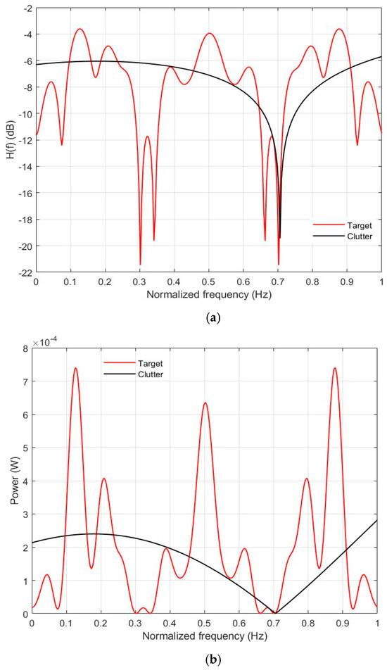 Waveform design for cognitive radar has long been a research focus [3,4,5]. Waveform design is a constrained optimization problem that involves selecting the optimization criteria and constraints, which depends on the requirements of a specific task. Common optimization criteria include the signal-to-interference-plus-noise ratio (SINR), mutual information (MI), and minimum mean square error (MMSE). Typical waveform constraints include the constant modulus, the peak-to-average power ratio (PAPR), and energy constraints [6,7]. According to the definition of the waveform domain, cognitive waveform designs can generally be classified into two main categories: frequency-domain and time-domain optimal waveform designs. Frequency-domain waveform design primarily focuses on the energy spectrum distribution of the target and clutter. We obtained the energy spectral density (ESD) of the waveform by solving the energy constraint considering an optimal output criterion. Kay [8] originally utilized the water-filling method (WFM) from communication theory to design a waveform in a noisy environment and obtained an analytical expression for the optimal waveform by maximizing the signal-to-noise ratio (SNR) criterion under an energy constraint. C.Y. Chen [9] improved an iterative algorithm to jointly optimize the transmitted waveforms and receiving filters of the MIMO radar for the case of an extended target in clutter. However, the statistical characteristics of the clutter should be precisely known for this solution.