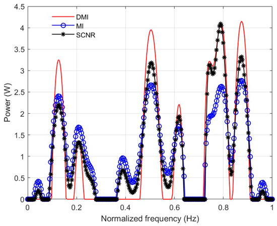 To further compare the discrepancies of the designed waveforms based on various criteria, the optimal waveforms in the frequency domain were obtained using the WFM under three criteria—maximizing the DMI, MI, and SCNR—as shown in Figure 4. The shapes of the designed waveforms in the presence of the maximization SCNR and MI criteria were similar, and energy was consistently allocated in the frequency band corresponding to the higher target TIR. Additionally, the DMI criterion does not allocate more energy when the target TIR is lower than the cluttered TIR.