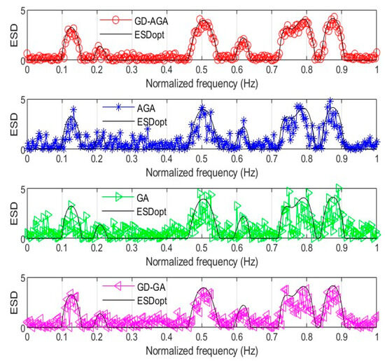After 100 Monte Carlo stochastic simulation calculations, and of the waveforms obtained by the four algorithms for various parameter values are provided in Table 3. It is observed that for the improved GA strategy, the GD-GA or AGA can effectively reduce the discrepancy between the synthesized waveform and ESDopt; however, in terms of waveform orthogonality, the AGA demonstrates better performance compared with the GD-GA. When the GD algorithm and adaptive parameter tuning strategy are integrated into the GA, the proposed GD-AGA is superior to the other three algorithms in terms of both the waveform approximation effect and orthogonality.