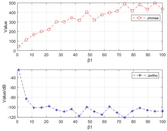 Considering that the regularization parameter has a weighted impact on and , the interval value was set to [0, 100], and the average value of 100 random simulation experiments is shown in Figure 7. The plotted results indicate that as the value of increases, the value of increases, which reveals that the waveform approximation effect is poor, and the value of decreases, which indicates better orthogonality among the waveforms. Consequently, a trade-off between the waveform approximation effect and orthogonality can be achieved by adjusting the tuning parameter value according to the actual requirements.